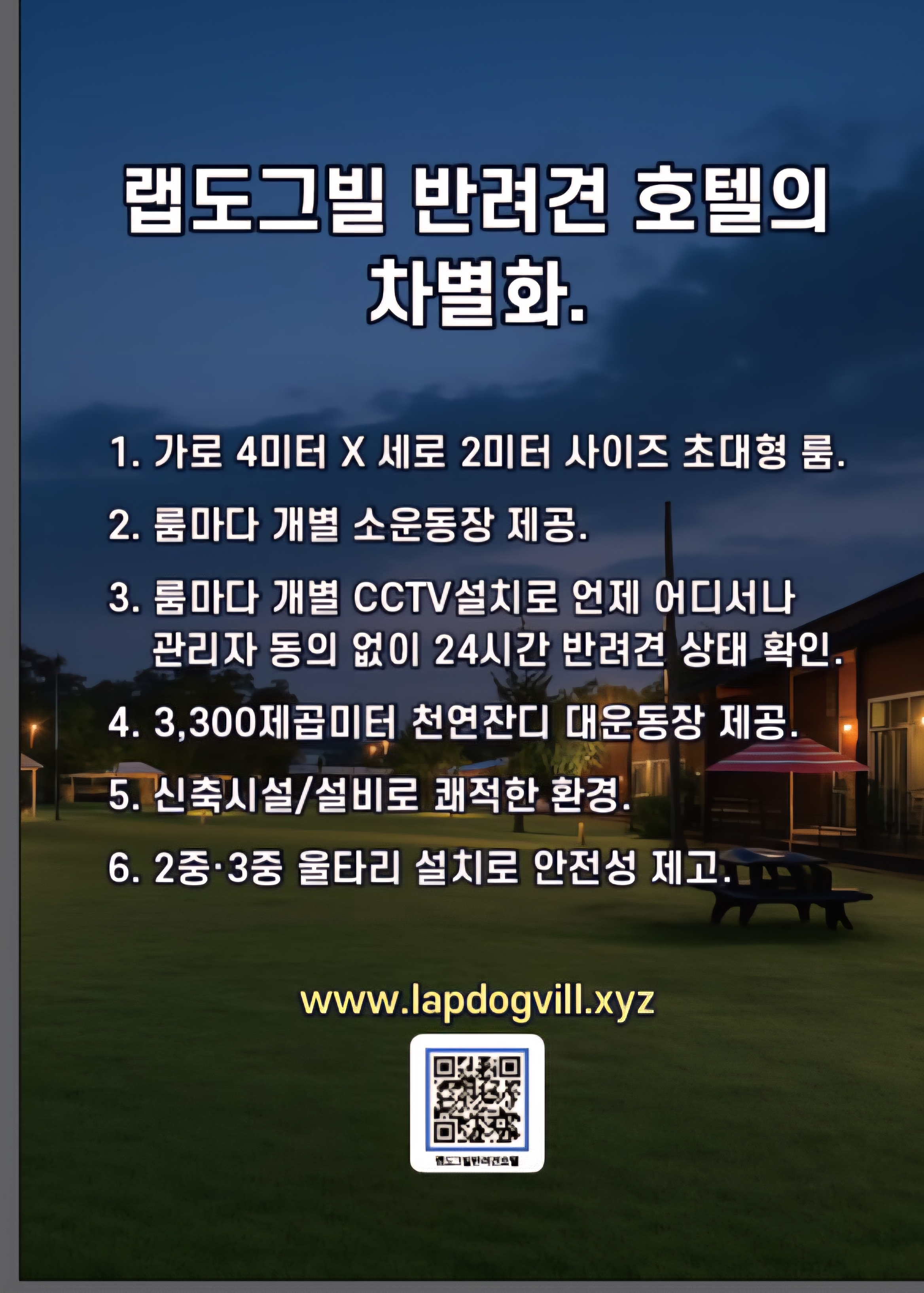 호텔 구성 - 룸,마당,카메라 일체형(개별 룸 2.4평, 개별마당 2~3평, 룸마다 보호자 확인 카메라 2대), 150평 모래자갈 공용 운동장, 1.000평 천연잔디 공용 운동장.